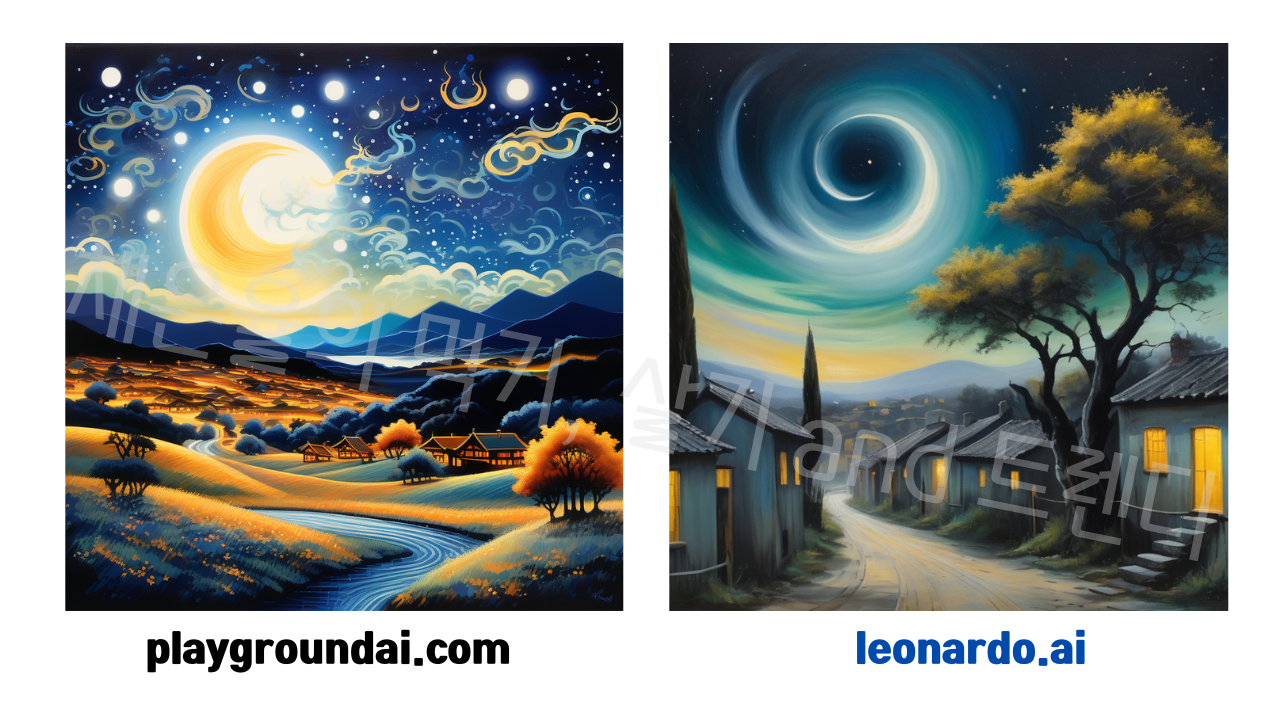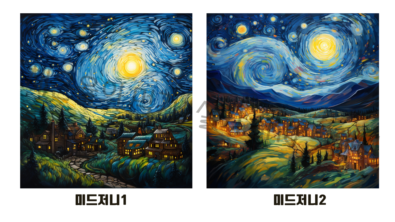 그나마 원작과 가장 비슷한 분위기의 유화 붓터치느낌을 내준건 미드저니가 아니었나 생각되는데 어떠신가요? 챗GPT 4.0의 DALL-E도 마을 분위기를 잘 살려주었다고 생각해요~